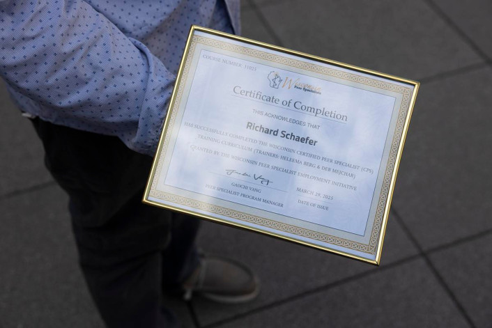 Rick Schaefer displays his certificate of completion as a trained certified peer specialist. (Joe Timmerman / Wisconsin Watch)