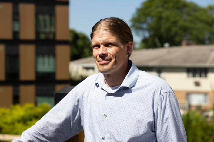 Rick Schaefer, a member of DUO Wisconsin, a union for current and former drug users, stands on the patio of his apartment building, July 23, 2025, in Madison, Wis. (Joe Timmerman / Wisconsin Watch)