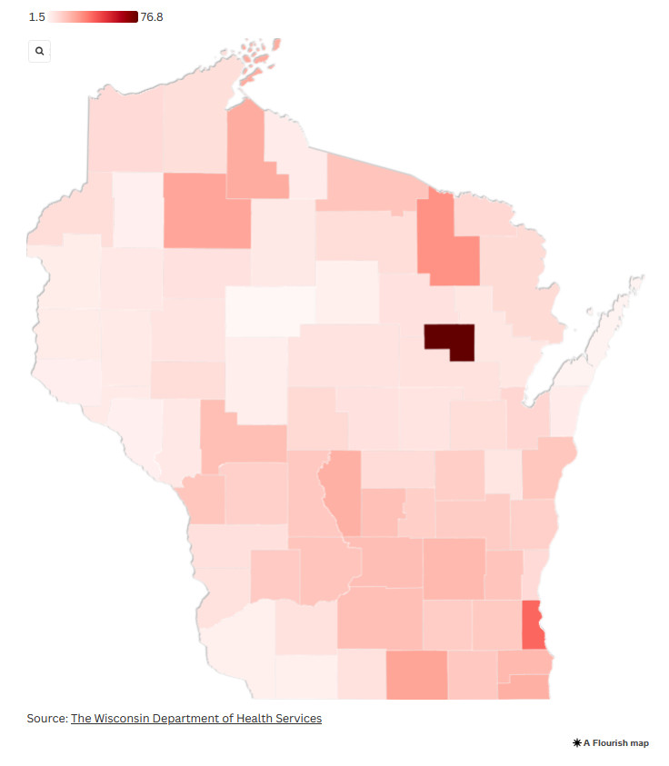 Wisconsin has lost thousands of residents to opioid overdoses in recent years, and that toll is uneven across its counties. Hover to see the opioids death toll per 100,000 residents from 2014 to 2023 — along with the share of local settlement funding each county has received.