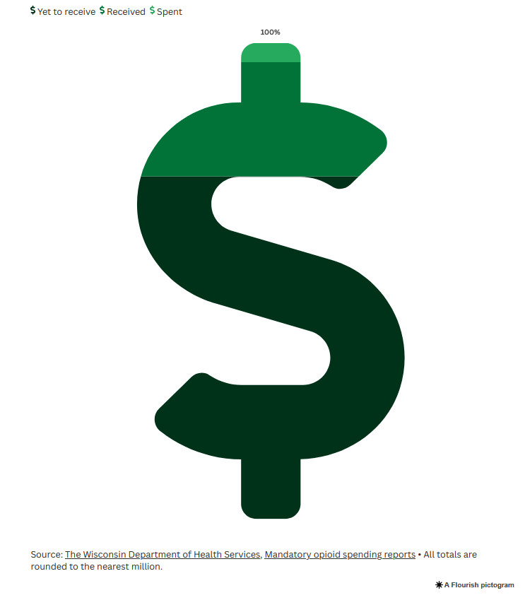 Wisconsin counties and municipalities are expected to receive $546 million by 2038 as part of a national opioids legal settlement — 70% of all settlement funds flowing to the state. This chart shows how much those governments have collectively received and spent as of Dec. 31, 2024.