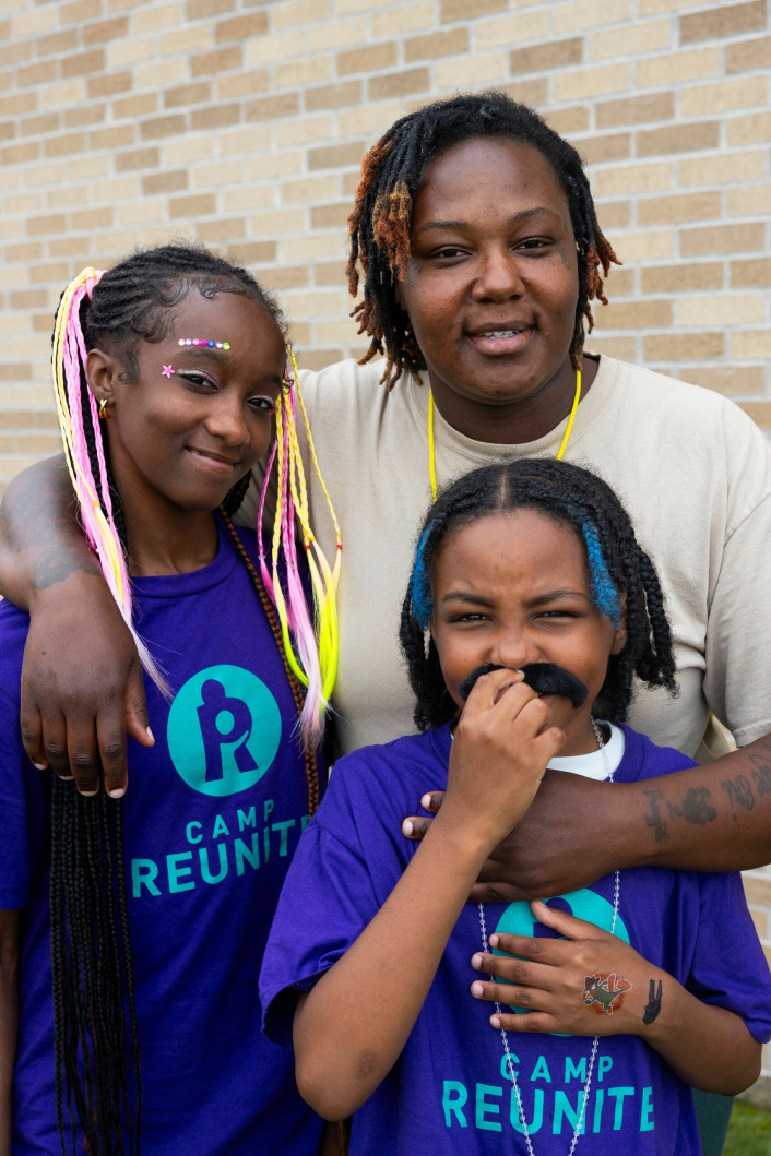 Deloise L. and her children Dariaz and Da’Netta stand outside for a family portrait during Camp Reunite at Taycheedah Correctional Institution. Deloise’s sister brings the children for somewhat regular visits throughout the year. But camp is different, she says. (Joe Timmerman / Wisconsin Watch)