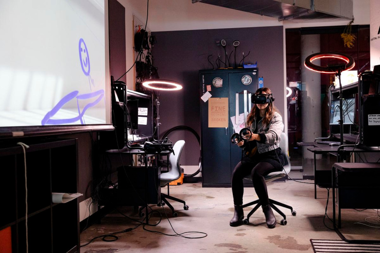 A student at the Milwaukee Institute of Art and Design uses virtual reality goggles in a studio on the college’s campus. (Courtesy of the Milwaukee Institute of Art and Design)