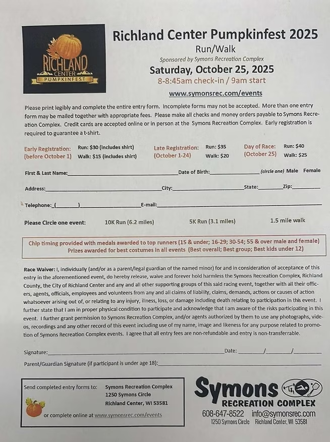 Symons Recreation Complex will also be holding a WALK / RUN and pool party in conjunction with Pumpkinfest. The events will be held on Oct. 25 and Oct. 26.