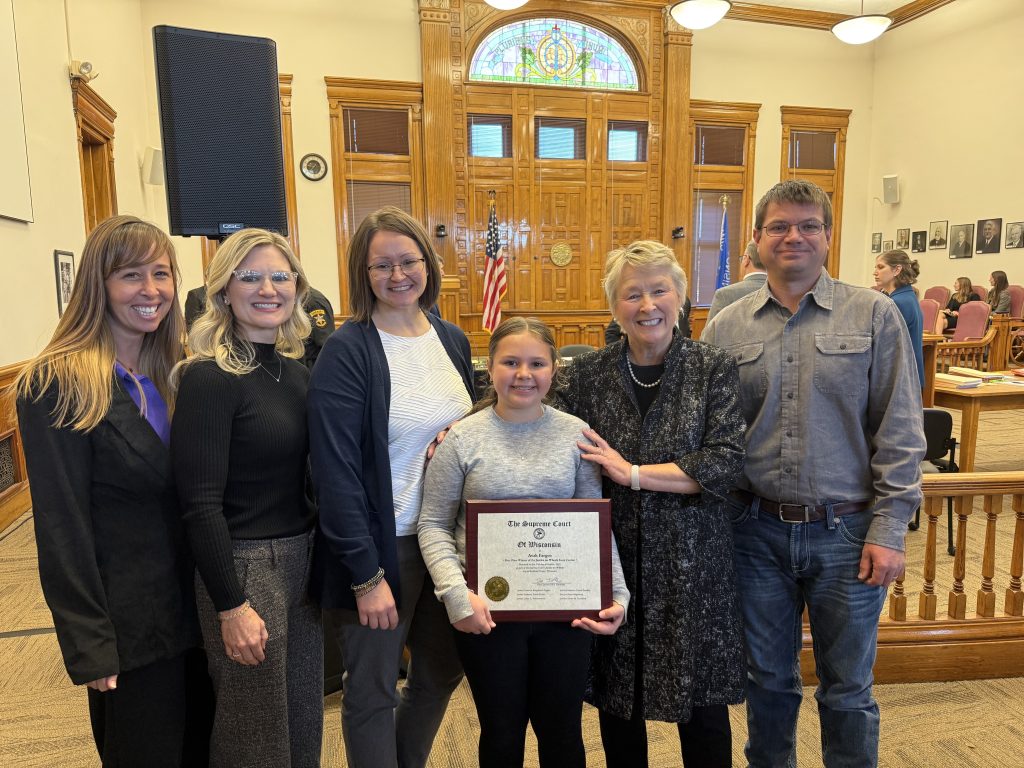 Avah Fargen, a fifth grader at Ithaca Schools, received a plaque for her first-place entry. Sawyer Perkins and Lydia Hall, both students from the Kickapoo School District, were also recognized as runners up.